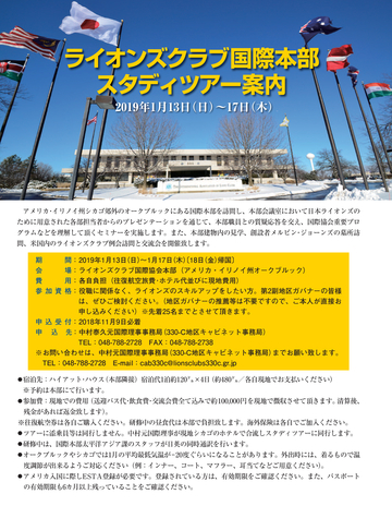 アメリカ・イリノイ州シカゴ郊外のオークブルックにある国際本部を訪問し、本部会議室において日本ライオンズの ために用意された各部担当者からのプレゼンテーションを通じて、本部職員との質疑応答を交え、国際協会重要プロ グラムなどを理解して頂くセミナーを実施します。また、本部建物内の見学、創設者メルビン・ジョーンズの墓所訪 問、米国内のライオンズクラブ例会訪問と交流会を開催致します。 期 会 費 参 間:2019年1月13日 (日) ~1月17日 (木) 〔18日 (金) 帰国〕 場:ライオンズクラブ国際協会本部(アメリカ・イリノイ州オークブルック) 用:各自負担(往復航空旅費・ホテル代並びに現地費用) 格:役職に関係なく、ライオンズのスキルアップをしたい方。第2副地区ガバナーの皆様 は、ぜひご検討ください。 (地区ガバナーの推薦等は不要ですので、ご本人が直接お 申し込みください)※先着25名までとさせて頂きます。 申 込 受 付:2018年11月9日必着 申 込 先:中村泰久元国際理事事務局 (330-C地区キャビネット事務局) TEL:048-788-2728 FAX:048-788-2738 ※お問い合わせは、中村元国際理事事務局 (330-C地区キャビネット事務局) までお願い致します。 TEL:048-788-2728 E-mail:cab330c@lionsclubs330c.gr.jp