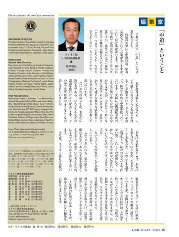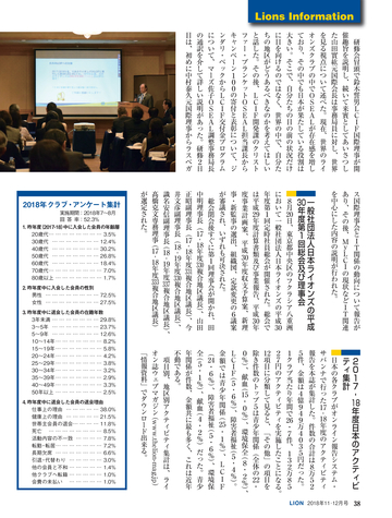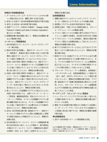 グドラン・イングバドター国際会長並びに山田實紘LCIFキャンペーン100国際 委員長公式訪問 キャンペーン100 ● 「世界が必要とするライオンズの支援」 国際理事だより ●「世界最大の奉仕団体の使命を思う」安澤莊一 LIONS INFORMATION 37:スペシャルオリンピックスの全国大会を支援/37:複合地区・地区の事務局 員を対象としたセミナー開催/38:一般社団法人日本ライオンズの平成30年度第 1回総会及び理事会/38:2017-18年度日本のアクティビティ集計/39:2018年ク ラブ・アンケートによる入退会者調査/40:国際理事会決議事項要約