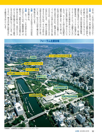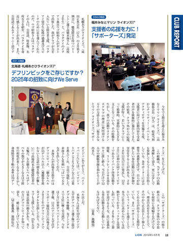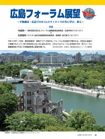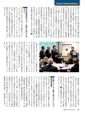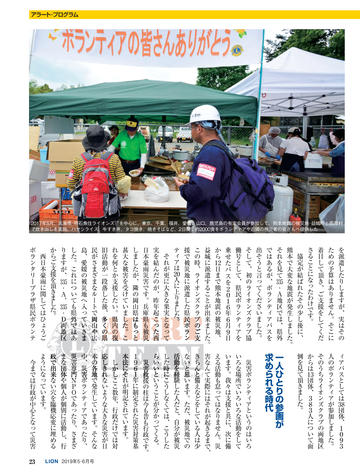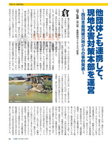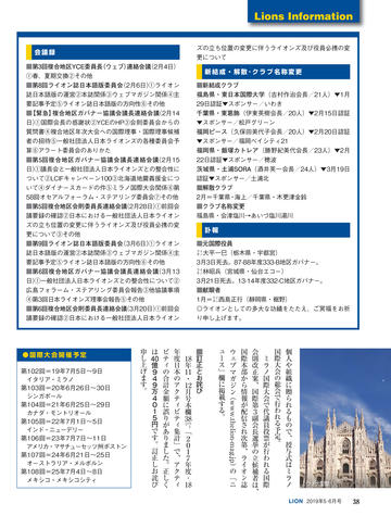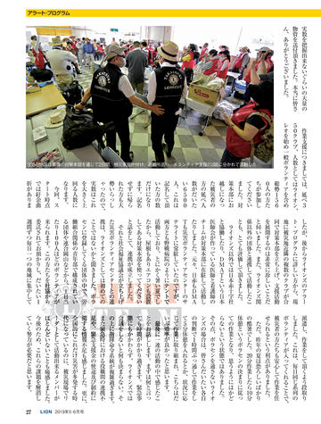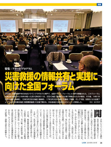 ライオン誌日本語版ウェブマガジン更新情報 国際会長メッセージ ● 「植樹は希望をもたらす」 SCENE ● 秋田県大内/福岡県久留米ちとせ CLUB REPORT 10:青森県弘前津軽/11:岩手県平泉/12:群馬県笠懸/12:北海道北広島/ 13:群馬県前橋/14:宮崎県都城シティー/14:北海道釧路ぬさまい/15:334ゾー /16:静岡県藤枝/16:愛知県名古屋みなと/17:岐阜県 A地区7リジ ョン1ン (愛知県) 美濃加茂/18:福井みなとマリン/18:北海道札幌あさひ/19:岐阜県高山/ 19:広島ニュー 特集 ● アラート・プログラム 2月3日、兵庫県神戸市で全国アラート・フォーラム in 神戸が開催された。この フォーラムは東日本大震災から1年半が経った2012年9月11日、332-C地区の主催 で開催されたのが最初。その後、14年1月335-A地区、15年3月332-D地区、17年3 月333-C地区で開催。そして今回、5回目となる全国フォーラムが335複合地区の 主催で開かれ、日本各地から約460人のメンバーが参加した。 20: 「災害救援の情報共有と実践に向けた全国フォーラム」 /22: 「災害ボランテ ィア並びにライオンズクラブとの協働」鬼本英太郎/25: 「他団体とも連携して、 現地水害対策本部を運営」山下弘展 広島フォーラム展望 ● 対談:寺越愼一 vs 矢野敏明 国際理事だより ●「日本ライオンズから平和を発信」 佐藤義雄 LIONS INFORMATION 35:2018-19年度国際平和ポスター・コンテスト大賞決定/35:熊本地震災害に対 する一連のLCIF交付金事業が完了/36:次年度地区ガバナー就任に向けたセミ ナー/36:広島フォーラム第1回ステアリング委員会開催/37:第3回ライオンズ クエスト・フォーラム全国大会開催/37:ミラノ国際大会情報 LCIF年次報告 Foundation Impact LCIF FILE 獅子吼 46:道下秀之/47:綾香正博/48:村迪男/49:川嶋亜基夫 もう一度読みたい 「あの記事」● 「献血をして」 ふるさと探訪 ● 埼玉県行田 READERS ROOM 56:読者から/読者プレゼント 57:ライオン誌クイズ 編集室 ●「災害と誤嚥性肺炎」椿幸雄 日本ライオンズクラブ 分布図