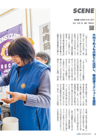 読者会員の皆様へ ●今号のライオン誌 特集は「アラート・プログラム」 。335複合地区が主催し たアラート・フォーラムの内容を収録。表紙写真は、2011年 の東日本大震災の折、岩手県大槌町で5日間、炊き出し奉 仕を続けた茨城県・水戸葵ライオンズクラ ブ のメンバーたち。 ●投稿にご協力を 「クラブ・リポート」欄ではクラブの活動に関する投稿を 募集しています。700字程度の原稿に写真を添えてお送り に関して深く掘り下げ、各クラブの今後の活動の参考とな る記事を提供していきます。国際協会の奉仕フレームワー クである「糖尿病」 「環境」 「視力」 「小児がん」 「食料支援」 や、日本のライオンズが力を入れる「青少年育成」につい て、他クラブの参考になる活動事例がありましたら、情報 をお寄せください。 <送付先>