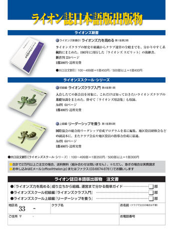 ●大口注文割引 (ライオンズスクール・シリーズ) :100〜499部=1部350円/500部以上=1部300円 ■合計で2万円以上ご注文の場合、送料無料(組み合わせは問いません) 。※ただし、急ぎの場合は実費請求 ■お申し込みはEメール (office@thelion.jp) またはファクス (03-6674-8781) でお願いします
