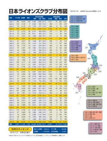 地区 330-A 330-B 330-C 330 計 331-A 331-B 331-C 331 計 332-A 332-B 332-C 332-D 332-E 332-F 332 計 333-A 333-B 333-C 333-D 333-E 333 計 334-A 334-B 334-C 334-D 334-E 334 計 335-A 335-B 335-C 335-D 335 計 336-A 336-B 336-C 336-D 336 計 337-A 337-B 337-C 337-D 337-E 337 計 総計 クラ ブ数 会員数 195 155 79 429 72 78 51 201 61 50 58 70 55 45 339 73 45 128 54 81 381 115 78 77 97 49 416 71 159 107 60 397 141 90 86 88 405 118 67 78 68 57 388 6,045 4,126 2,119 12,290 2,712 2,475 1,814 7,001 2,047 2,214 1,755 2,491 1,895 1,306 11,708 2,910 1,565 3,177 2,131 4,705 14,488 6,033 4,360 3,214 5,298 2,470 21,375 1,940 6,520 3,920 1,921 14,301 5,830 2,914 3,270 2,988 15,002 5,160 2,483 3,598 2,202 1,827 15,270 増減 146 2 15 163 30 36 33 99 22 20 13 38 7 12 112 35 8 19 ー13 22 51 48 36 ー10 13 29 105 45 19 37 ー7 58 70 51 18 9 19 17 男女別会員数 男性 女性(割合) 4,395 3,494 1,742 9,631 2,147 2,011 1,486 5,644 1,546 1,473 1,251 1,881 1,497 944 8,592 2,463 1,017 2,493 1,561 3,188 4,091 3,098 2,716 3,707 1,716 1,558 4,649 3,242 1,516 4,470 2,408 2,697 2,613 3,728 1,994 2,486 1,836 1,466 1,650 ( 27.3 ) 632 ( 15.3 ) 377 ( 17.8 ) 2,659 ( 21.6 ) 565 ( 20.8 ) 464 ( 18.7 ) 328 ( 18.1 ) 1,357 ( 19.4 ) 501 ( 24.5 ) 741 ( 33.5 ) 504 ( 28.7 ) 610 ( 24.5 ) 398 ( 21.0 ) 362 ( 27.7 ) 3,116 ( 26.6 ) 447 ( 15.4 ) 548 ( 35.0 ) 684 ( 21.5 ) 570 ( 26.7 ) 1,517 ( 32.2 ) 3,766 ( 26.0 ) 1,942 ( 32.2 ) 1,262 ( 28.9 ) 498 ( 15.5 ) 1,591 ( 30.0 ) 754 ( 30.5 ) 6,047 ( 28.3 ) 382 ( 19.7 ) 1,871 ( 28.7 ) 678 ( 17.3 ) 405 ( 21.1 ) 3,336 ( 23.3 ) 1,360 ( 23.3 ) 506 ( 17.4 ) 573 ( 17.5 ) 375 ( 12.6 ) 子会員 1,571 396 286 2,253 473 379 277 1,129 399 772 460 561 328 304 2,824 295 526 395 547 1,772 3,535 1,917 1,384 379 1,615 759 6,054 145 1,552 363 259 2,319 928 298 396 179 1,801 1,022 370 1,134 204 256 2,986 家族会員数 増減 男性 74 ー1 6 79 ー1 ー1 3 1 ー1 ー1 2 6 ー6 9 9 ー7 ー2 10 ー4 ー5 ー3 ー1 ー1 ー82 2 0 20 1 4 25 1 ー16 8 ー1 ー8 8 2 0 2 ー1 11 女性 520 1,051 120 276 91 195 731 1,522 96 55 74 225 84 147 96 125 61 49 85 377 324 203 904 315 625 364 436 267 255 210