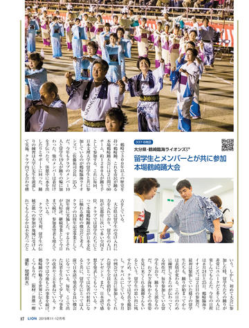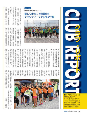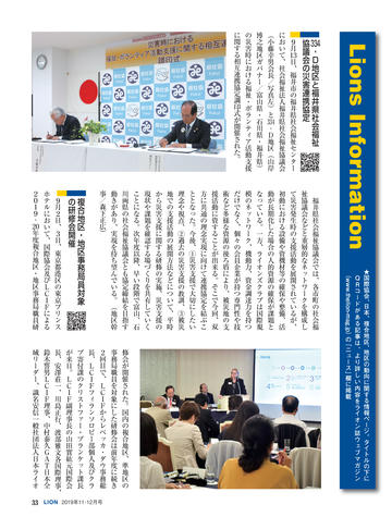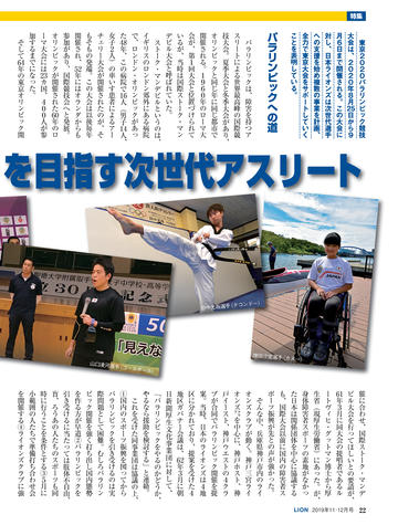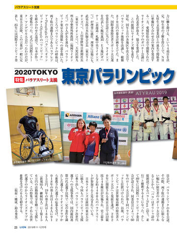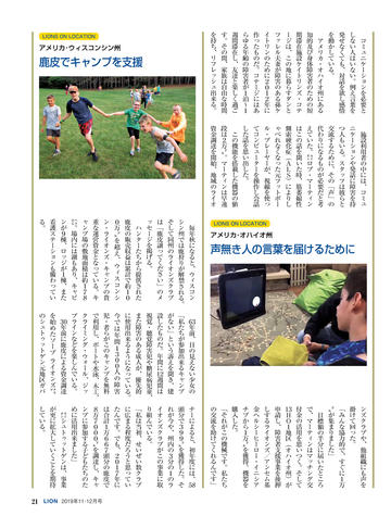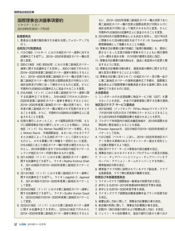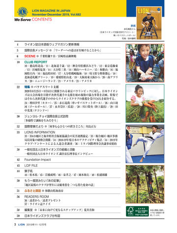 ライオン誌日本語版ウェブマガジン更新情報 国際会長メッセージ ● 「リーダーへの道は耳を傾けることから」 SCENE ● 千葉県鎌ケ谷/宮崎県高鍋舞鶴 CLUB REPORT 10:徳島県北島/11:北海道千歳/12:神奈川県横浜みどり/12:東京葛飾東 /13:宮城県塩釜/14:大分県三重/14:岡山ハーモニー/15:和歌山/16:福 岡県庄内/16:福島県田村/17:大分県鶴崎臨海/18:埼玉県与野新都心/18: 北海道札幌グリーン/19:愛媛県松山北/19:大阪府東大阪D・S/20:南アフリ カ/20:ニュージーランド/21:アメリカ/21:アメリカ 特集 ● パラアスリート支援 2020年8月25日〜9月6日に開催される東京パラリンピックに対し、日本ライオン ズは大会出場を目指す次世代選手の支援を始め複数の協力事業を計画。特集で はそれら次世代選手の中からライオンズクラブの推薦を受けた6人を紹介する。 24:増田汐里 (カヌー) /25:赤石竜我 (車いすバスケットボール) /26:山口凌 河 (ゴールボール) /27:永井崇匡 (柔道) /28:川口梨央 (陸上競技) /29:田 中光哉 (テコンドー) ジュンヨル・チョイ国際会長公式訪問 「多様性で調和を生みだそう」 国際理事だより ●「何事も心ひとつの置きどころ」川島正行 LIONS INFORMATION 33:334-D地区と福井県社会福祉協議会の災害連携協定/33:複合地区・地区事務 局員対象の研修会開催/34:2018-19年度日本のアクティビティ集計/34:2019年 クラブ・アンケートによる入退会者調査/36:ミラノ国際理事会決議事項要約 一般社団法人日本ライオンズの組織と活動 一般社団法人日本ライオンズ 識名安信理事長インタビュー Foundation Impact LCIF FILE 獅子吼 44:松本祐/45:岩橋成明/46:泉孝之/47:岡本和夫/48:松浦則雄 もう一度読みたい 「あの記事」 「地区最低のクラブが翌年には優秀賞を二つも得た変身の話」 ふるさと探訪 ● 和歌山県海南市 READERS ROOM 56:読者から/読者プレゼント 57:ライオン誌クイズ 編集室 ●「未来に向けて更なるステップアップ」荒井喜和 日本ライオンズクラブ分布図