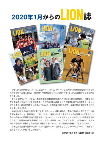 今年4月の国際理事会において、2020年7月1日から、ライオン誌公式版の印刷版最低発行回数を現 在の年4回から2回に削減し、印刷版への補助金を会員1人当たり年4㌦から2㌦に減額することが決定 されました。 これを受けて、ライオン誌日本語版委員会は補助金減額への対応策を慎重に検討し、国際協会の 方針を始めとするライオンズ情報や、クラブの奉仕活動を会員の皆様に伝達する重要なツールとし てのライオン誌の役割を十分に果たすために、経費削減を図りながら、年6回発行を維持するとの方 針でまとまりました。 2020年1・2月号 (19年12月20日発行予定) から、ページ数を減らし、企画の見直しを行うなどして経 費削減を図る一方、国際協会、LCIF、GAT、一般社団法人日本ライオンズの情報ページを設けて、 会員の皆様への情報伝達の役割を強化していきます。ライオン誌ウェブマガジンは一部企画を見直 した上で、毎月1回の更新を継続します。また、印刷版・ウェブマガジン共に、全国の地区、クラブ からお寄せ頂く原稿と写真を豊富に掲載してまいります。ぜひ積極的な投稿にご協力ください。 今後も読者会員の皆様の活動に役立つ誌面づくりに全力を尽くしてまいりますので、ご理解とご 協力をよろしくお願い申し上げます。 2019-20年度ライオン誌日本語版委員会